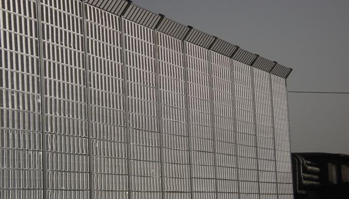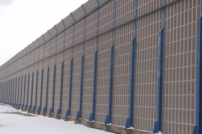 隔音墻就外形可做為直立型、折角型,但是折角型隔音墻的效果更優越于直立型隔音墻,其隔音墻的頂端向聲源方向伸出一個挑檐(即折角型),就相當于將整個隔音墻向聲源方向移動,可以有效地增加陰影區域的深度和面積。我公司生產的隔聲吸聲板由于增加了阻尼層空氣層,隔聲量高,隔聲頻帶寬,低頻吸聲明顯。隔聲系數達到0.85以上。是其他廠家無法比擬的。